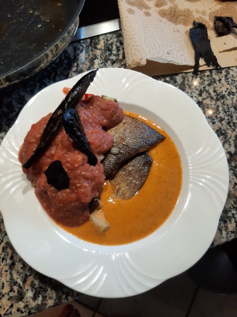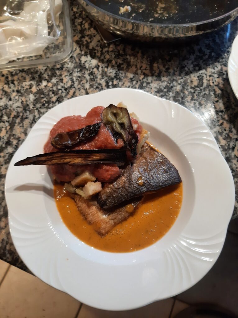 Wolfsbarsch mit Melanzanipanzanella, Kapern und Paradeispüree: