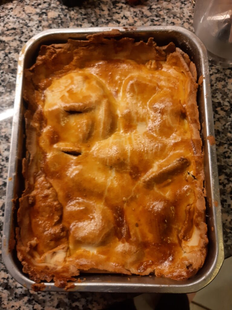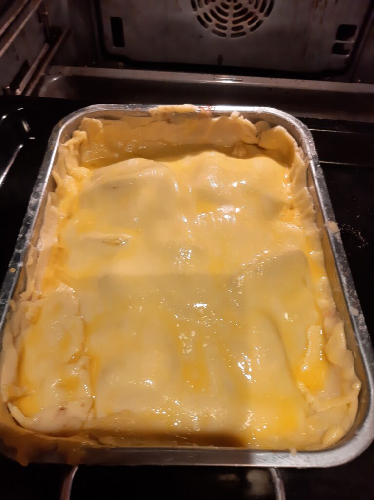 - Nun die Apfelscheiben mit dem Zimt und dem Zucker vermischen (wenn man Lust hat, kann man auch etwas Ingwer-Pulver dazugeben) und auf dem Mürbteig-Blech gleichmäßig verteilen. Danach die zweite Mürbteigplatte ausrollen und so wie beim Boden verfahren. Diese über die Äpfel legen. Den gedeckten Apfelkuchen mit dem Ei-Milchgemisch bestreichen und bei 180 Grad ca 30 Minuten goldbraun backen.