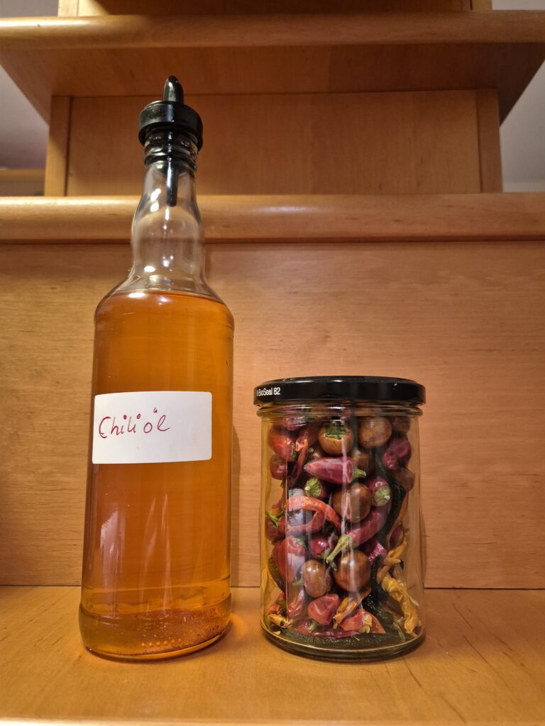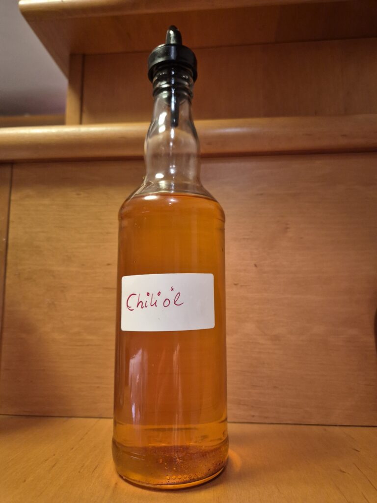 Hinweis: Der Schärfegrad des Chiliöls steht und fällt mit den Chilis und deren Verarbeitung. Möchtest du SEHR scharfes Chiliöl, verwendest du scharfe Chilis wie Thai Chilis, Habaneros oder andere scharfe Chilis. Die Schärfe steckt auch hauptsächlich in der Membran (Häutchen) und den Kernen der Chilis. Möchtest du das Öl etwas milder, entferne die Samen und die Membran. Trage dabei aber UNBEDINGT Handschuhe, denn die Schärfe wird auf die Haut übertragen und geht von dort nicht so leicht weg. Berührst du mit den ‚Chilifingern‘ dann die Augen oder den Mund, brennt das höllisch und dauert eine Weile, bis sich das legt. Ich weiß das aus eigener Erfahrung SEHR gut! 😉