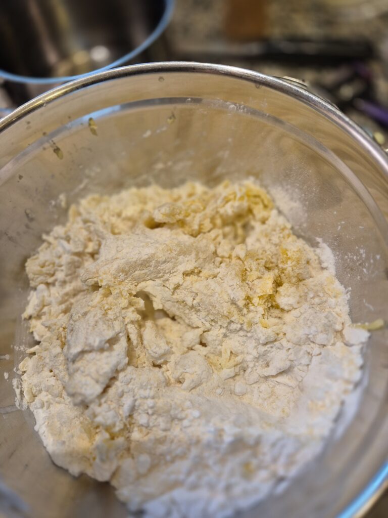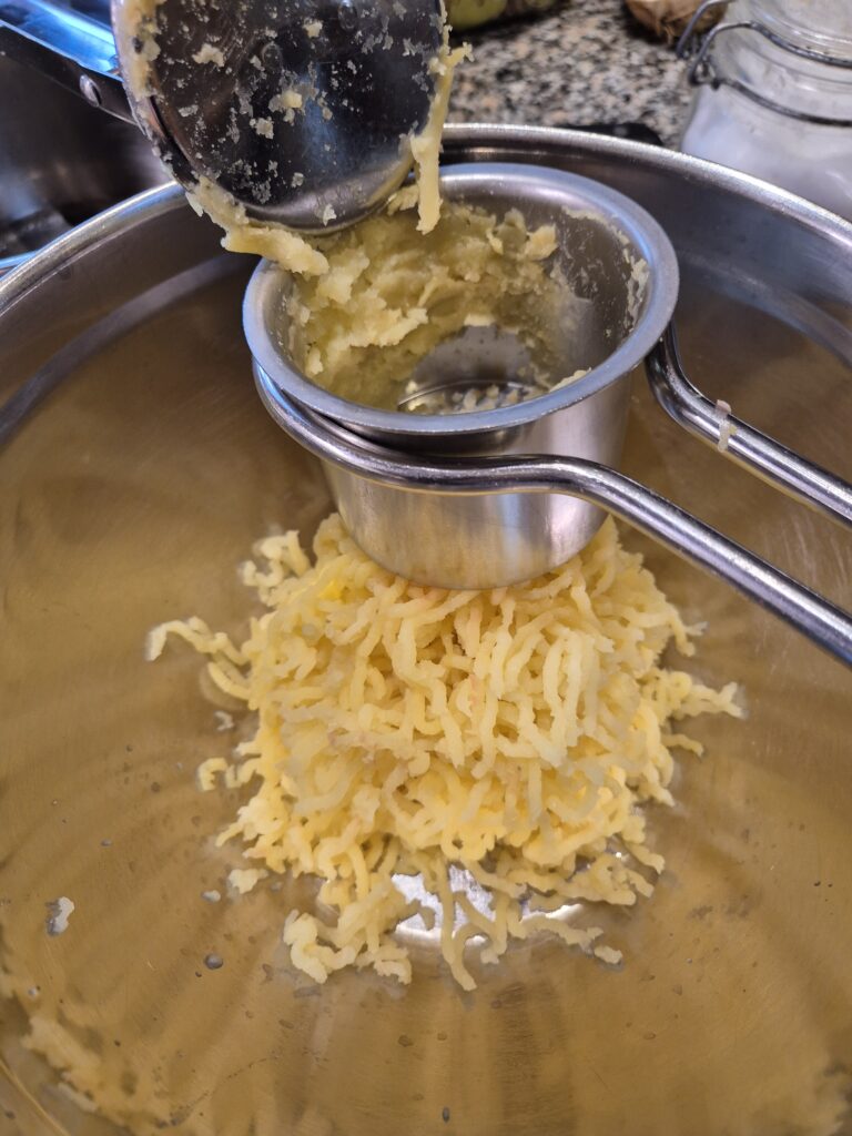Die am Vortag mit der Schale gekochten Erdäpfel schälen und durch die Erdäpfelpresse drücken.