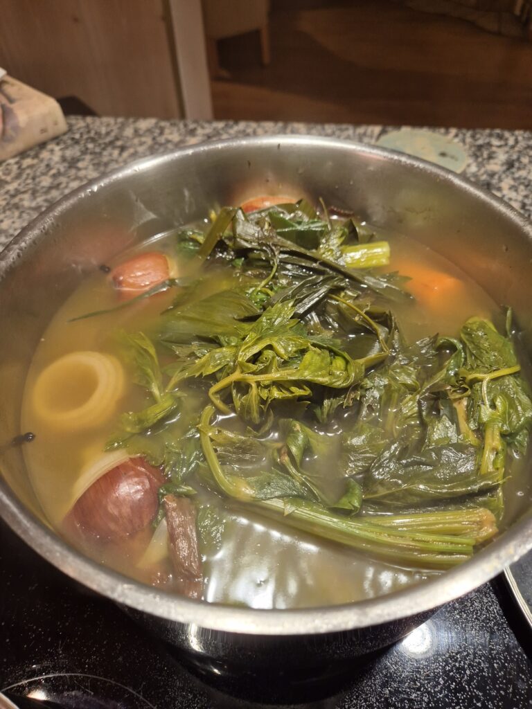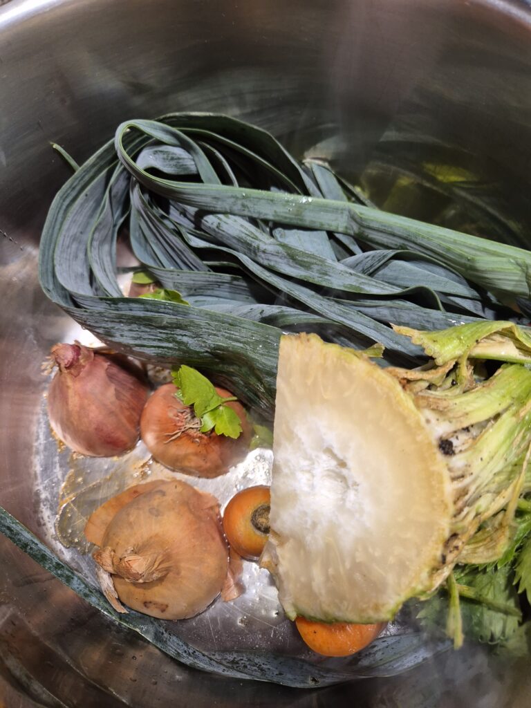 Tipp: Das ist der Grund-Gemüsejus. Man kann in die Suppe jegliche Gemüsereste und Abfälle geben, außer Kohlgemüse, denn das schmeckt man letztendlich und es schmeckt sehr ’nachhaltig‘ nach Kohl!