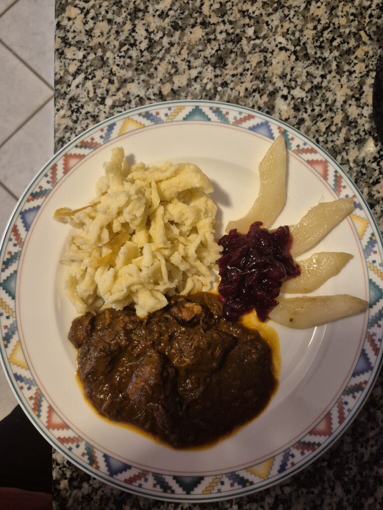 Rehragout mit Spätzle, gebratenen Birnen und Cranberry-Kompott