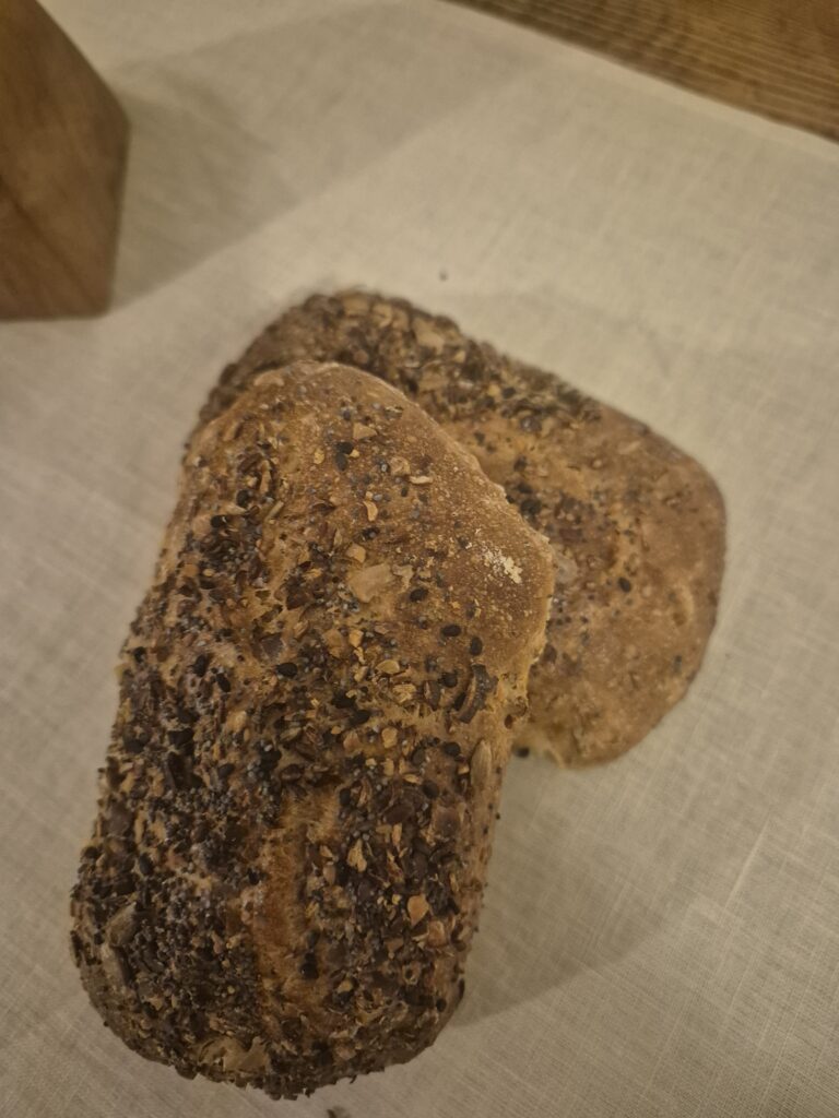 7.00 Uhr : Zutaten für den Vorteig miteinander vermischen und zugedeckt 5-7 Stunden rasten lassen, bis sich der Teig sichtlich bergrößert hat und Bläschen bildet. Für das Brühstück die Saatenmischung mit dem kochenden Wasser übergießen und bis zur weiteren Verwendung zudecken. Durch das Übergießen und einweichen in Wasser wird verhindert, dass der Teig später an Feuchtigkeit verliert.