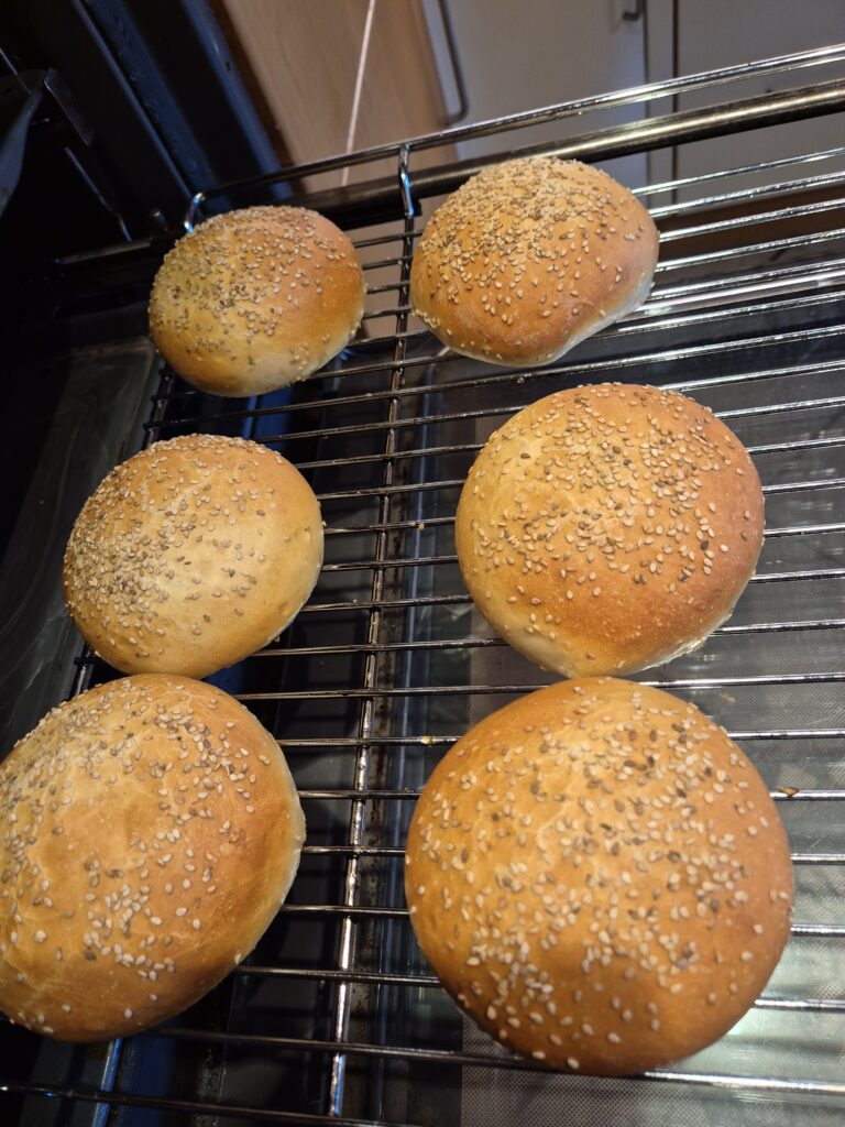 Alle Zutaten genau einwiegen und den Teig 3 Minuten langsamer, anschließend 6 Minuten auf Stufe 2 kneten, danach 20 Minuten ruhen lassen. Den Teig auf eine leicht bemehlte Arbeitsfläche geben und 6 Stück zu 120 g abwiegen, diese locker rund formen bzw. schleifen und auf ein Backblech legen, dabei ganz leicht flach drücken. Anschließend abgedeckt ruhen lassen, bis sie die doppelte Größe erreicht haben (ca. 30-40 Minuten). Den Ofen auf 200°C vorheizen. Auf den Boden des Backofens ein leeres, feuerfestes Gefäß stellen und mit aufheizen. In der Zwischenzeit die aufgegangenen Burgerbuns mit Wasser besprühen und mit Sesam bestreuen. Die Buns auf die mittlere Schiene des Ofens schieben, in das Gefäß am Boden des Ofens ein Glas mit eiskaltem Leitungswasser gießen und sofort die Tür schließen, um genügend Dampf zu erzeugen. Die Brötchen ca. 20 Minuten backen, danach auf einem Küchengitter auskühlen lassen.
