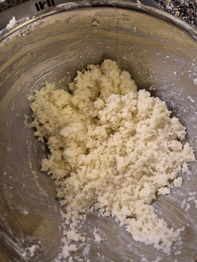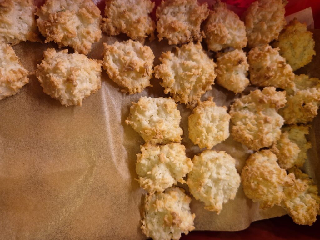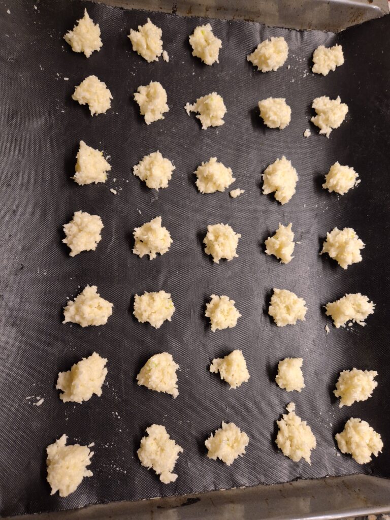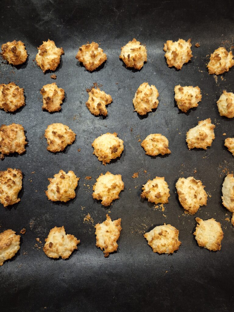 Eiklar mit Kristallzucker zu festem Schnee ausschlagen. Staubzucker, geriebene Zitronenschale und Kokosette mit einer Teigkarte unterheben. Die Masse in eine beschichtete Pfanne füllen und mit der Teigkarte in der Pfanne leicht rösten. Dabei immer wieder wenden und rühren, bis die Masse warm ist. Anschließend das Mehl einrühren. Backblech mit Backpapier belegen. Mit zwei Kaffeelöfferl Busserl formen und auf das Papier kleine Häufchen in genügend großem Abstand setzen. Im vorgeheizten Backrohr bei 200°C rund 15 Minuten backen, bis sie goldgelb sind.