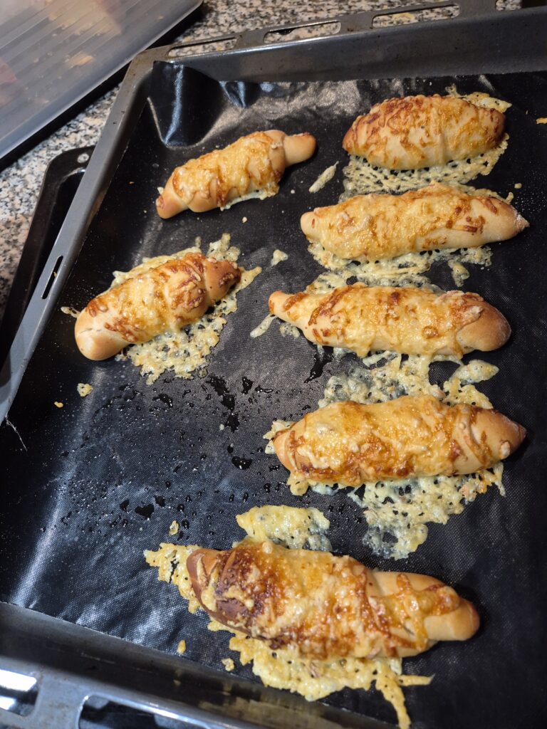 In der Zwischenzeit das Backrohr auf 210°C Heißluft vorheizen, die Gebäckstücke auf ein mit Backpapier belegtes Blech legen und mit viel Dampf ca. ca. 14 Minuten goldbraun backen.