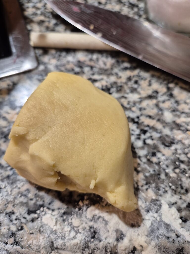 Aus Mehl, weicher Butter, Vanillezucker, Staubzucker und Backpulver einen Mürbteig bereiten und diesen rund 1 Stunde zugedeckt im Kühlschrank rasten lassen.