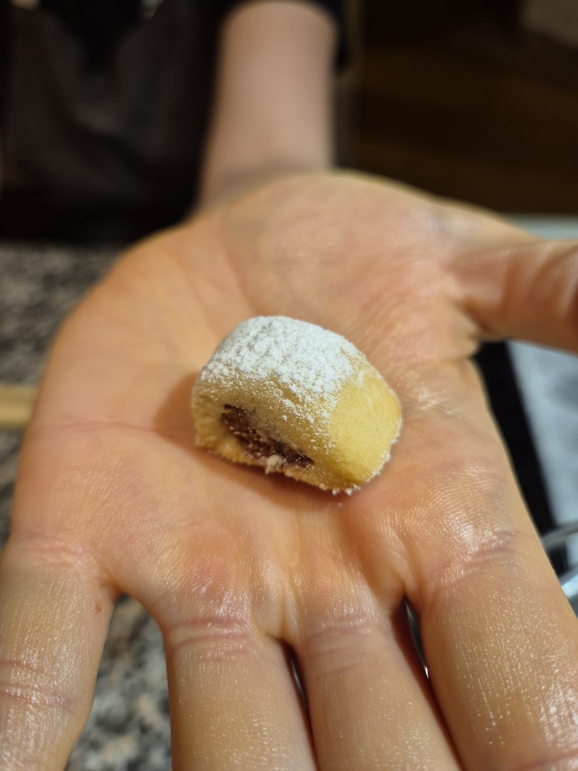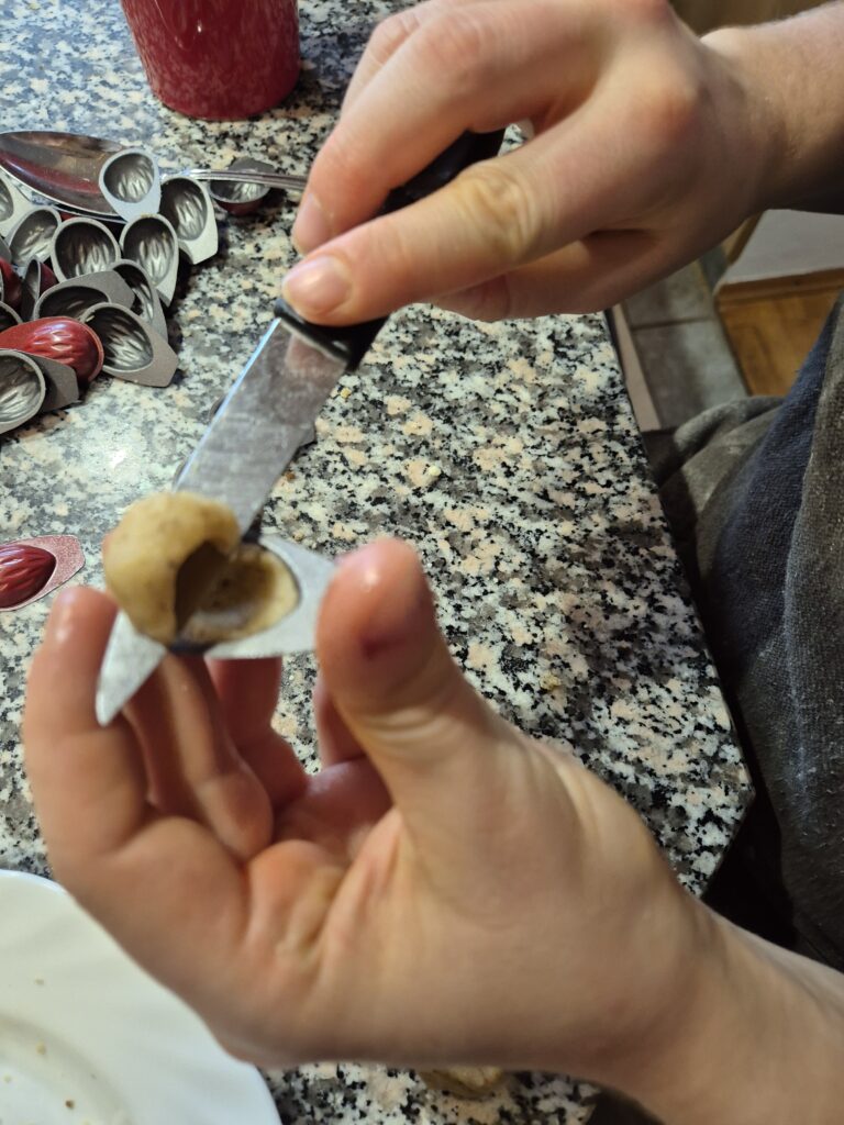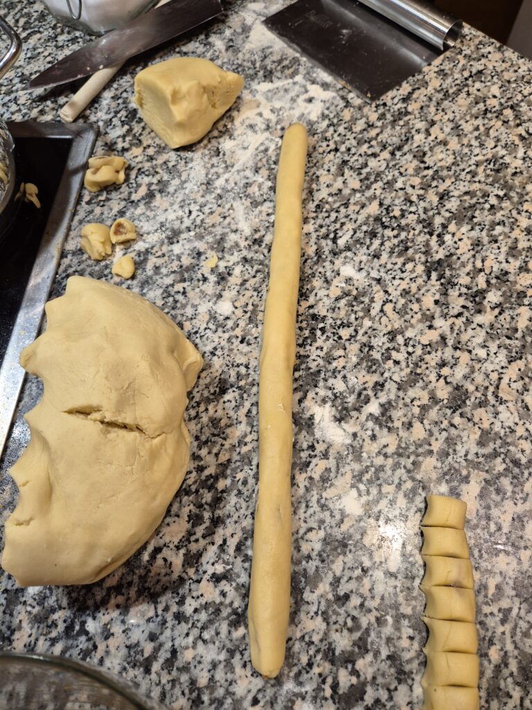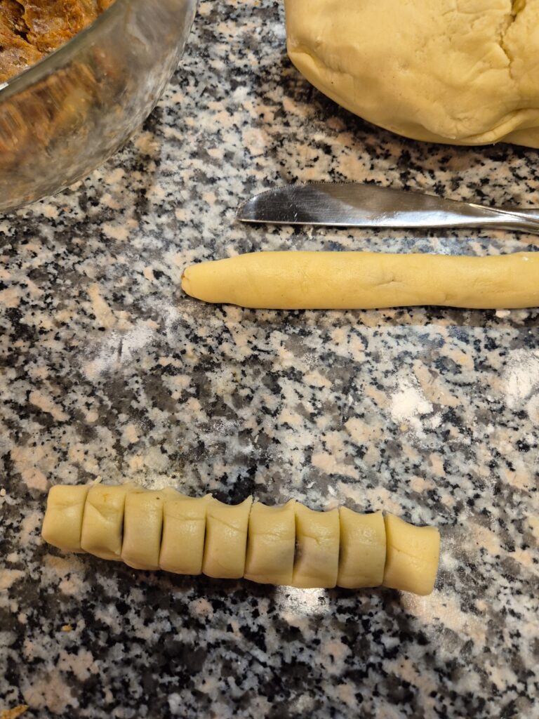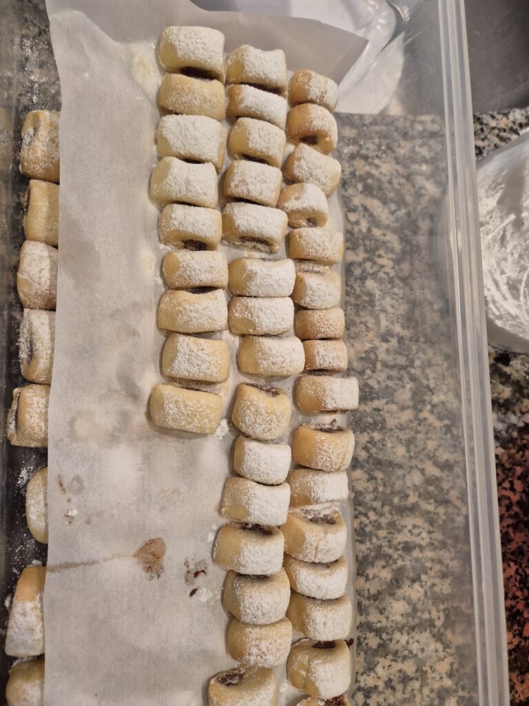 Aus dem Teig Rollen formen, in diese mit dem Kochlöffelstiel Vertiefungen drücken und da hinein kommt die Dattelfülle.. Den Mürbteig über der Dattelfülle verschließen und alles zu einer Rolle formen. Von der gefüllten Rolle fingerbreite Stücke abschneiden und diese auf ein Blech legen. Die Kekse bei 180°C rund 10-15 Minuten hell backen. Danach mit Staubzucker bestreuen und genießen