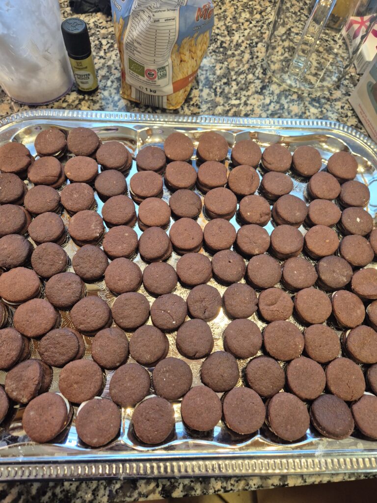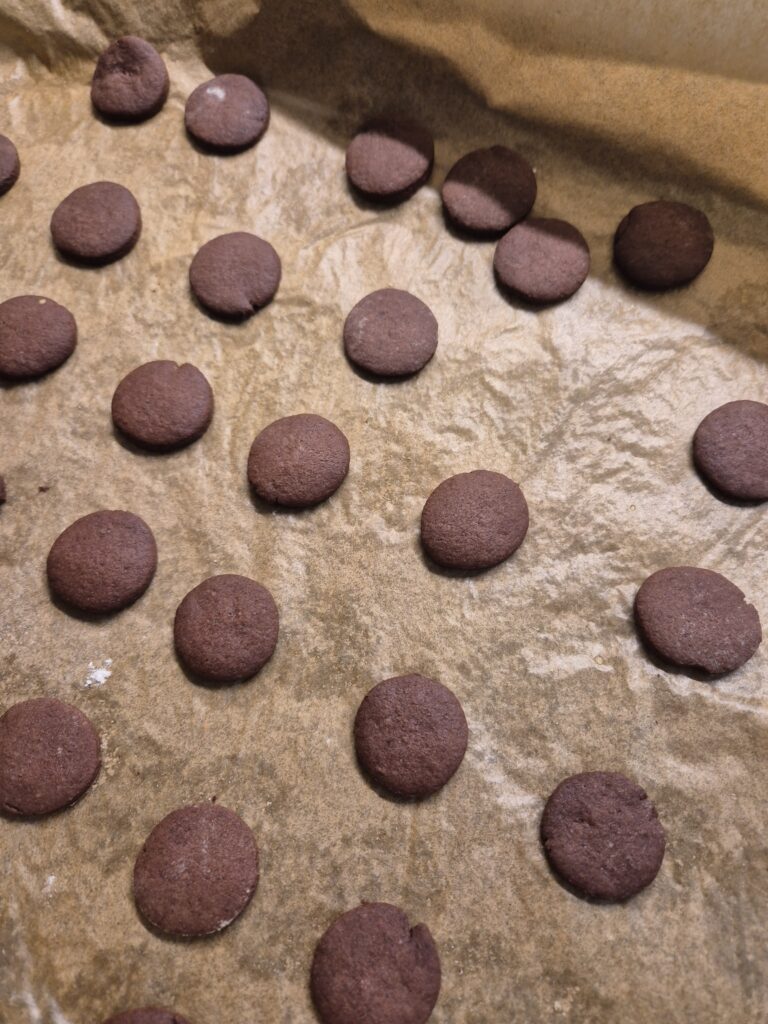 Teig ausrollen und Kreise mit ca. 2,5 – 3 mm Durchmesser ausstechen, diese auf ein Backblech, das mit Backpapier ausgelegt wurde, legen und hell backen (160°C Heißluft).