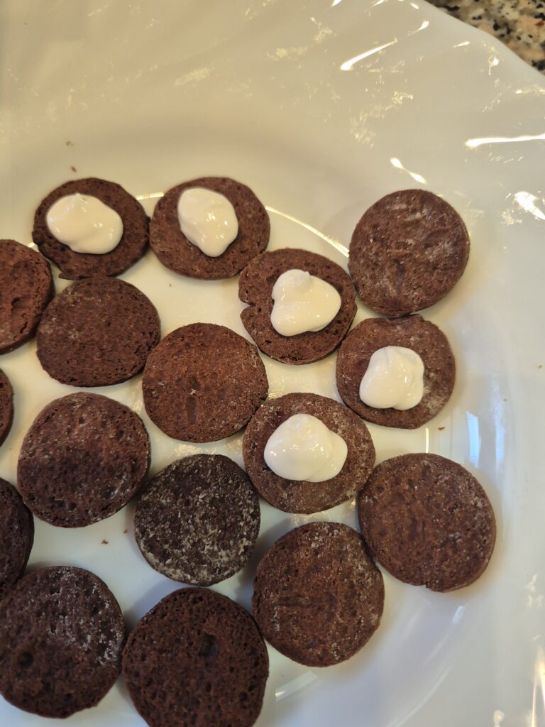 Zwei Kakaokekse mit der Eiweißcreme zusammensetzen und in Schokoglasur tauchen.
