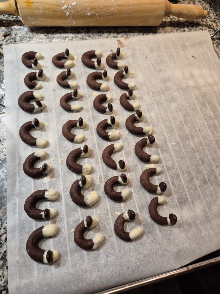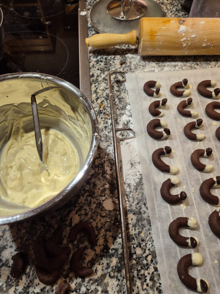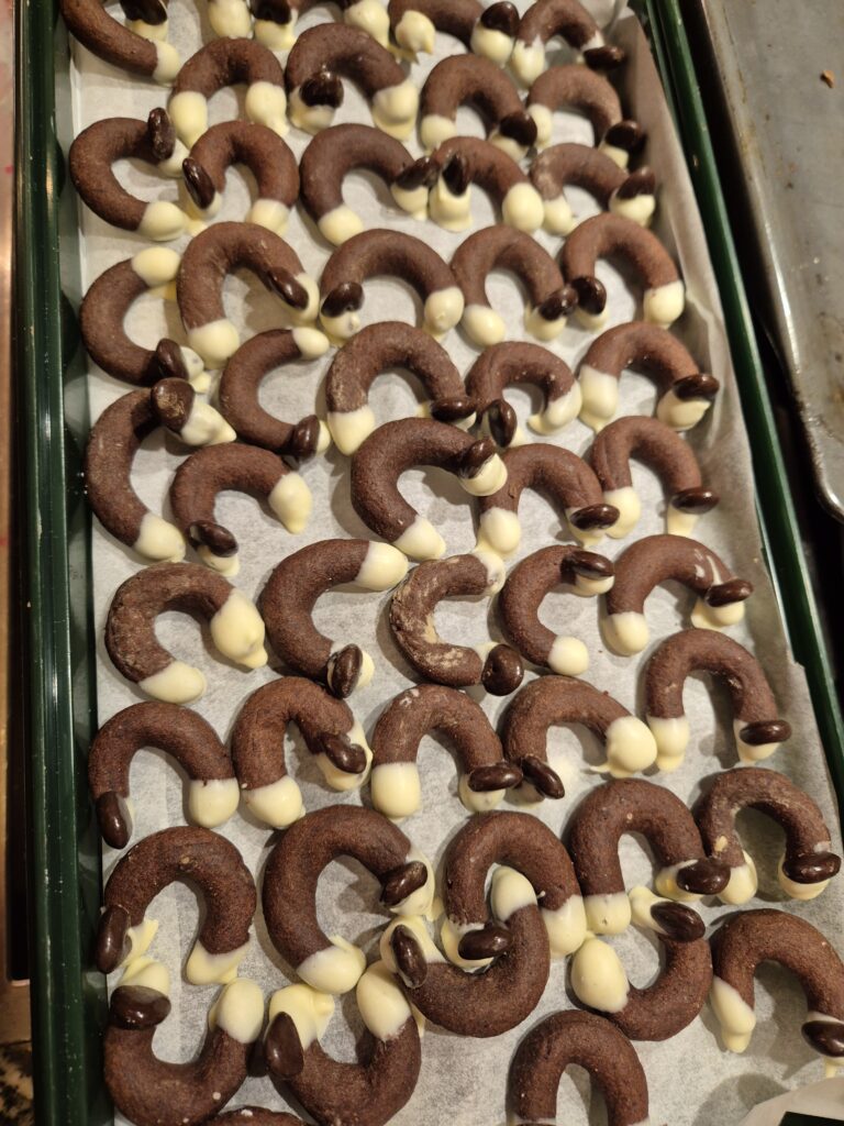 Die ausgekühlten Kipferl mit den Spitzen in weiße, geschmolzene Kuvertüre tauchen und mit einer halben Kaffeebohne belegen. Diese anschließend erkalten lassen und in Keksdosen schichten. (Haltbarkeit: ca. 8 Wochen oder länger)