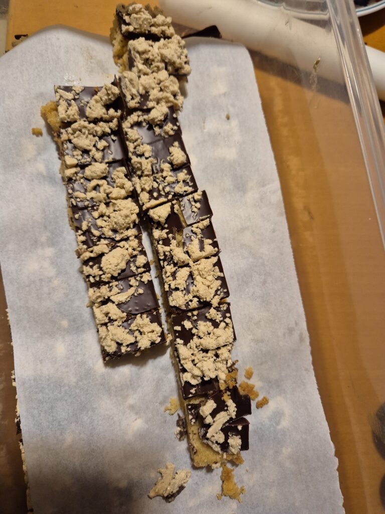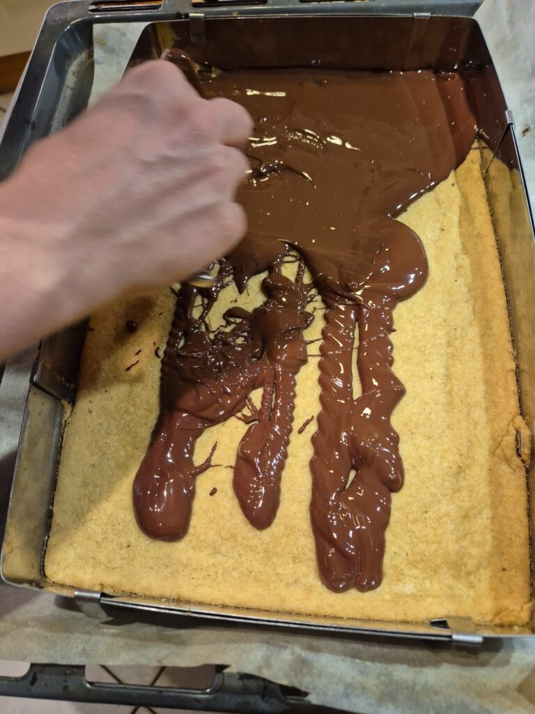 Das Shortbread etwas überkühlen lassen und mit geschmolzener Schokolade verstreichen.