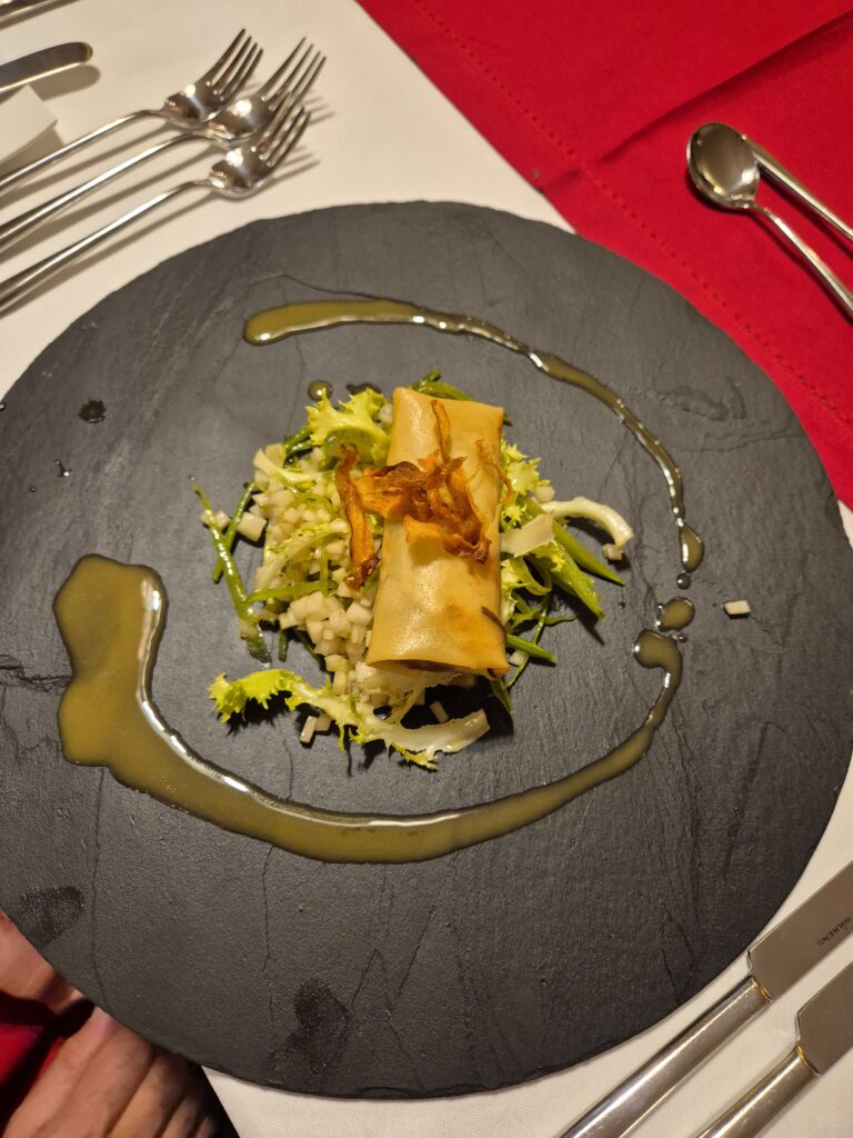 Vorspeise: Vegetarische Frühlingsrolle auf Kohlrabi-Zuckererbsensprossen mit Friséesalat, Dashi-Beurre-Blanc und Karottenchip