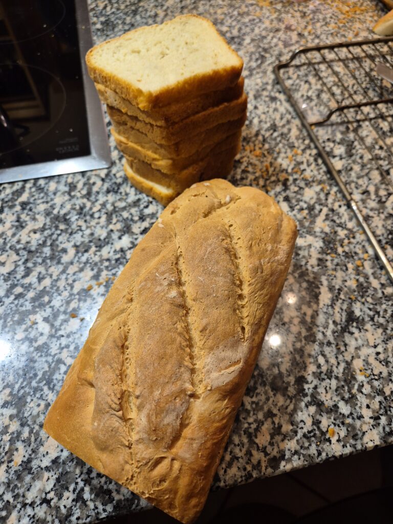 Anschließend den Teig halbieren und auf zwei mit Olivenöl ausgestrichene Kastenformen aufteilen. Zugedeckt noch einmal ca. 30 Minuten gehen lassen. Dann das Backrohr auf 180°C vorheizen und das Weißbrot ca. eine Stunde backen, bis es an der Oberfläche goldgelb ist. Wenn man das Brot aus der Form nimmt und auf die Unterseite klopft, muss es hohl klingen, dann ist es fertig.