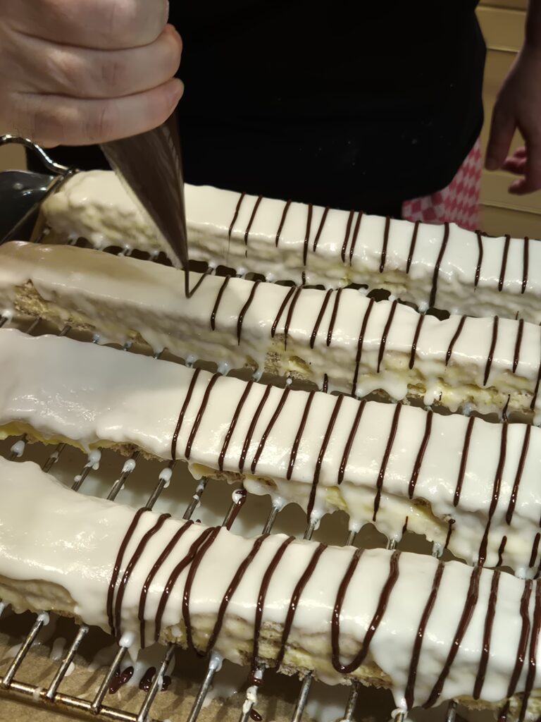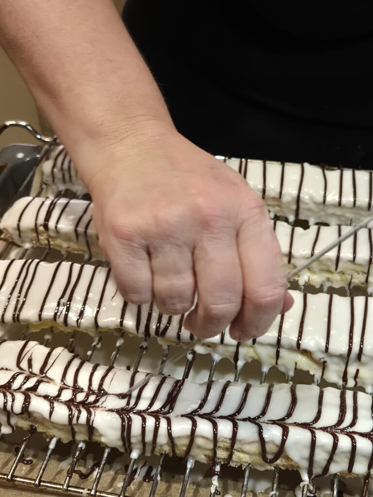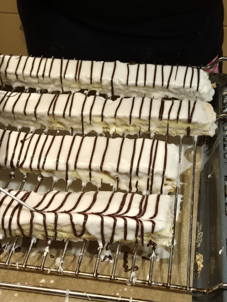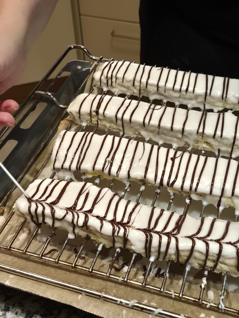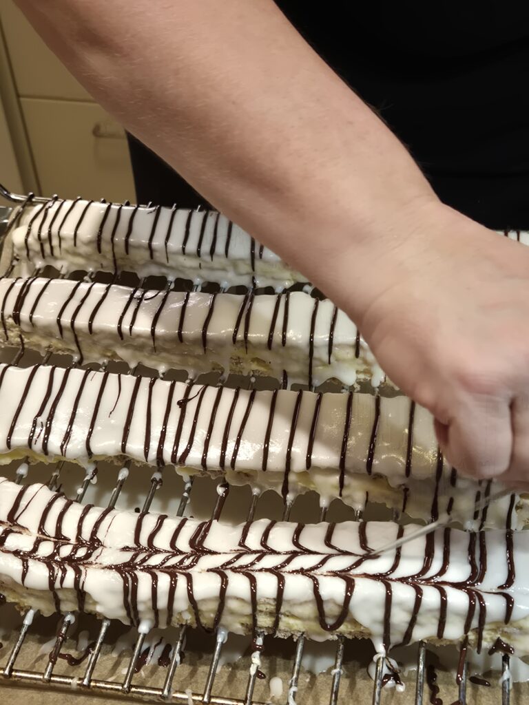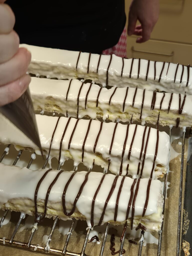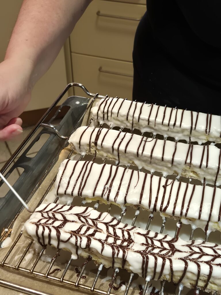 Für die Zuckerglasur Milch erwärmen, aber nicht kochen. Die Milch zum Zucker geben und verrühren. Kuvertüre erwärmen und in ein Backpapier-Stanitzel füllen. Die 2 Schnitten mit der weißen Glasur glasieren, Anschließend mit der Kuvertüre regelmäßige Streifen auftragen und mit einer Stricknadel Muster ziehen