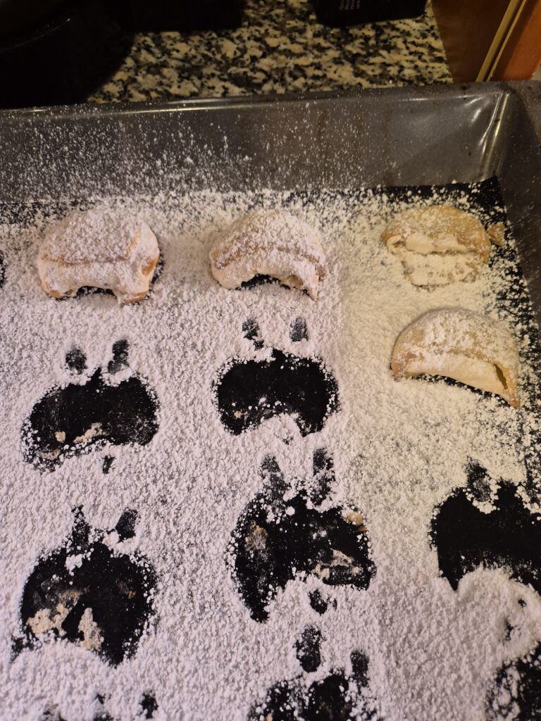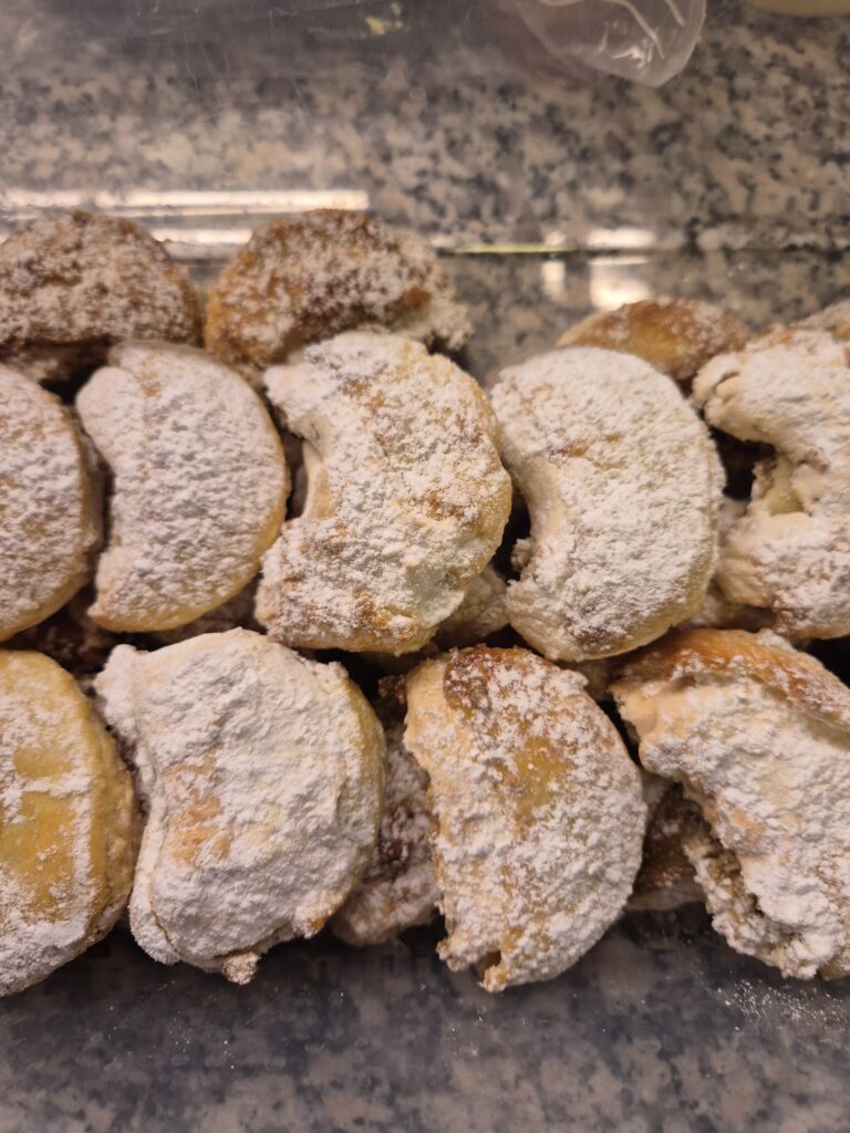 Mit einer Teigkarte ein Drittel des Eischnees draufstreichen, mit Nüssen bestreuen und von unten und von oben je zu einem Drittel einschlagen. Der Teigstreifen ist nun 3 cm breit. Diesen mit verquirltem Ei bestreichen. Mit einer runden Ausstechform von einer Seite Teigkipferl abstechen und auf ein mit Backpapier belegtes Blech legen. Bei 160°C die Kipferl ca. 12 Minuten lang backen, bis sie hellbraun sind.