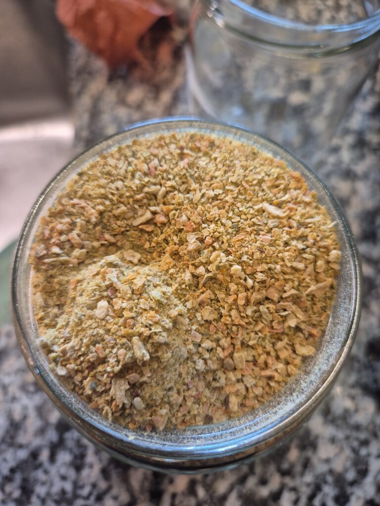 Anschließend die Platten von Hand grob zerkleinern und in einem Blender fein mahlen. In Gläser füllen. Das Suppenpulver hält Monate!