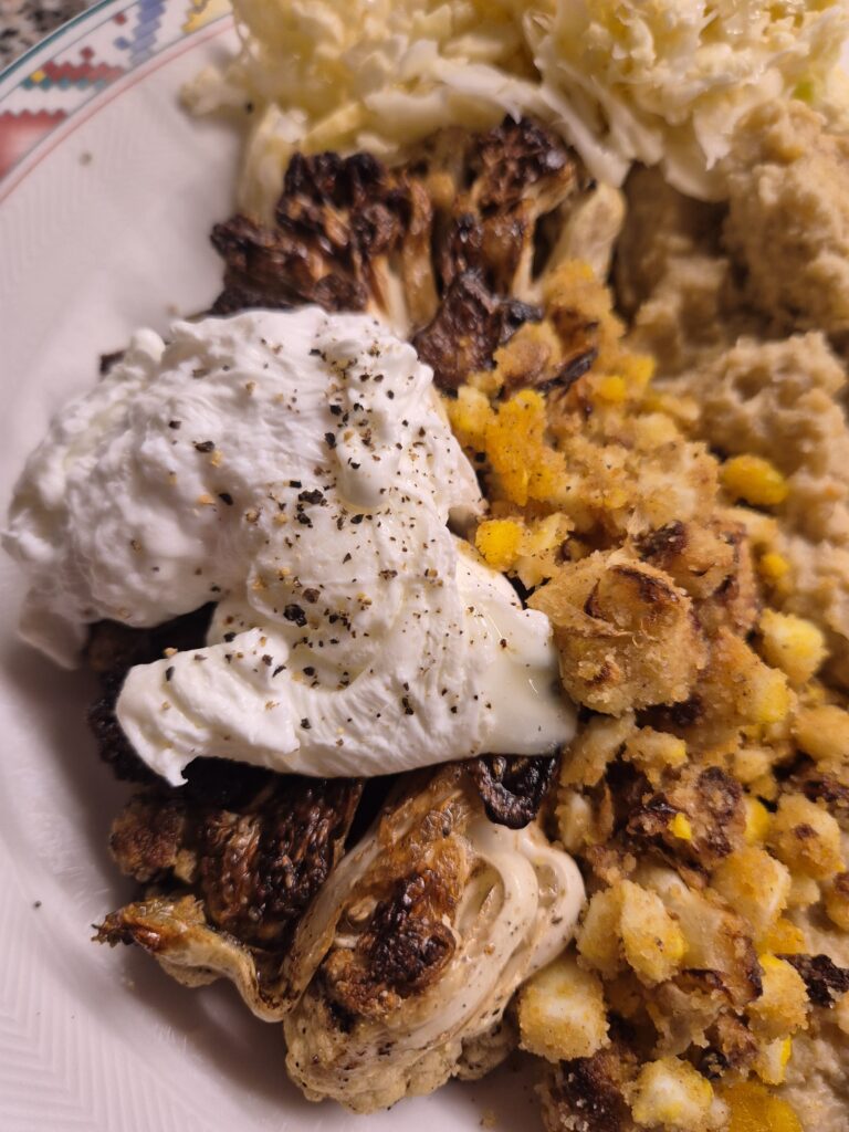 Die Karfiol-Variationen auf den Teller geben, die pochierten Eier dazu und die Creme darüberträufeln. Guten Appetit!