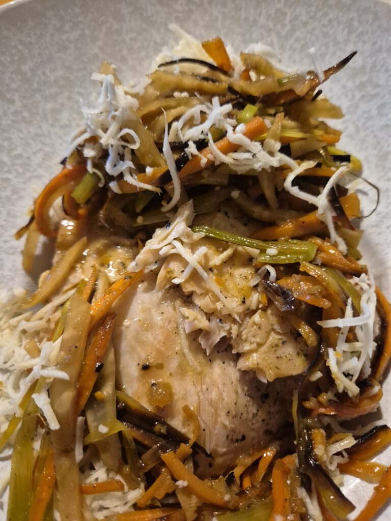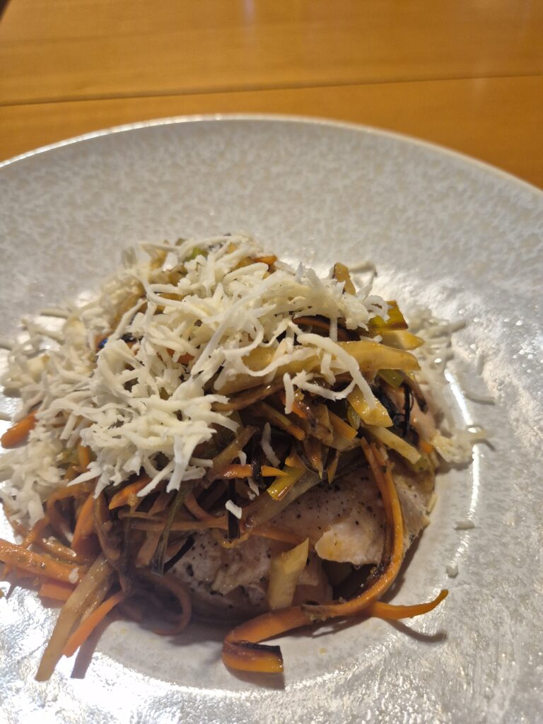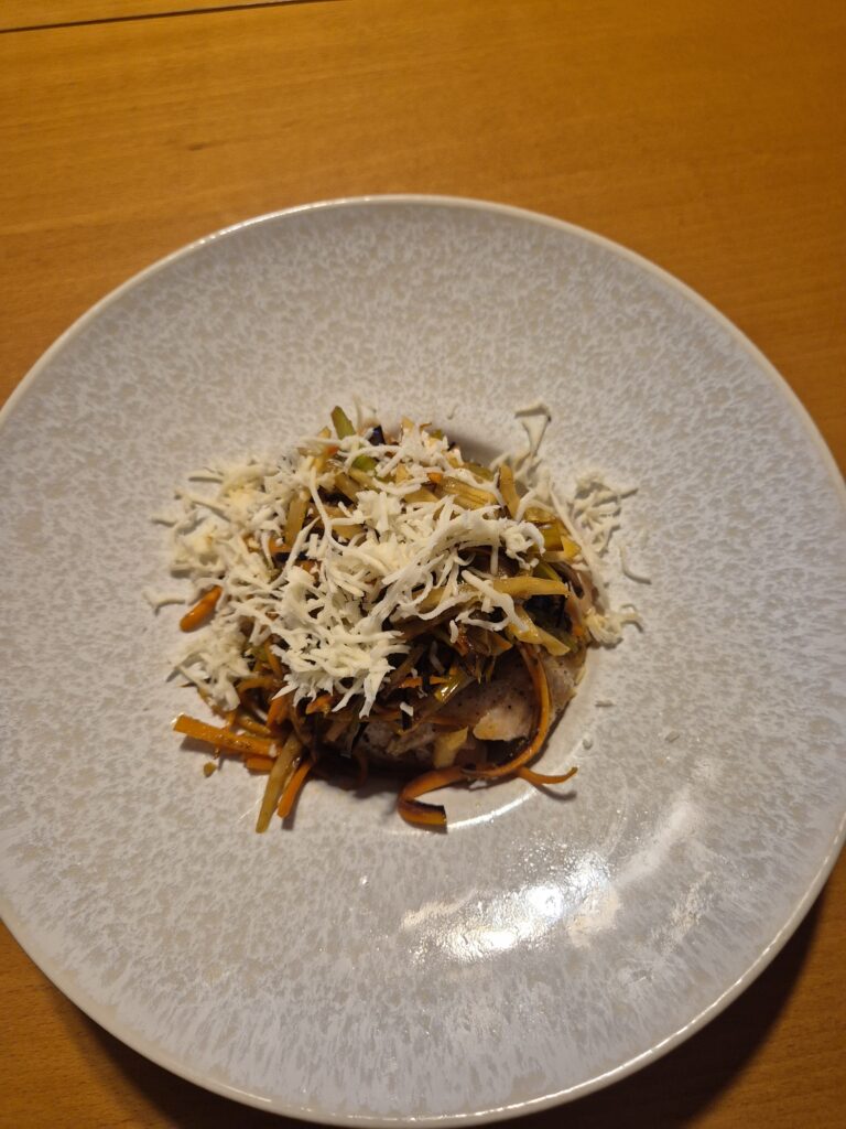 Anrichten: In einem tiefen Teller unten die gekochten und geviertelten Kipfler anrichten, darauf den Fisch legen und darüber das Julienne-Gemüse. Mit reichlich frisch geriebenem Kren bestreuen und dem übrigen Süd abgießen.